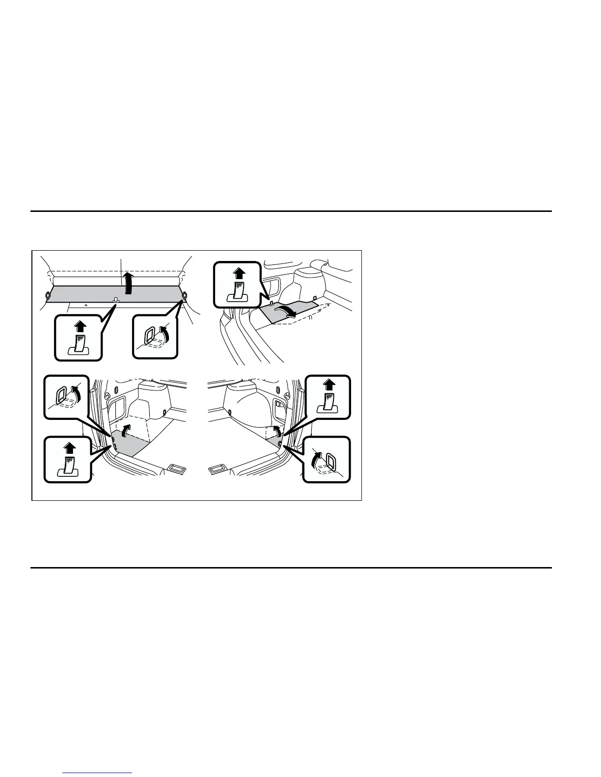 To open the lid, raise the cargo tie-down hooks and pull the tab up. The jack and jack handle are stored in the left