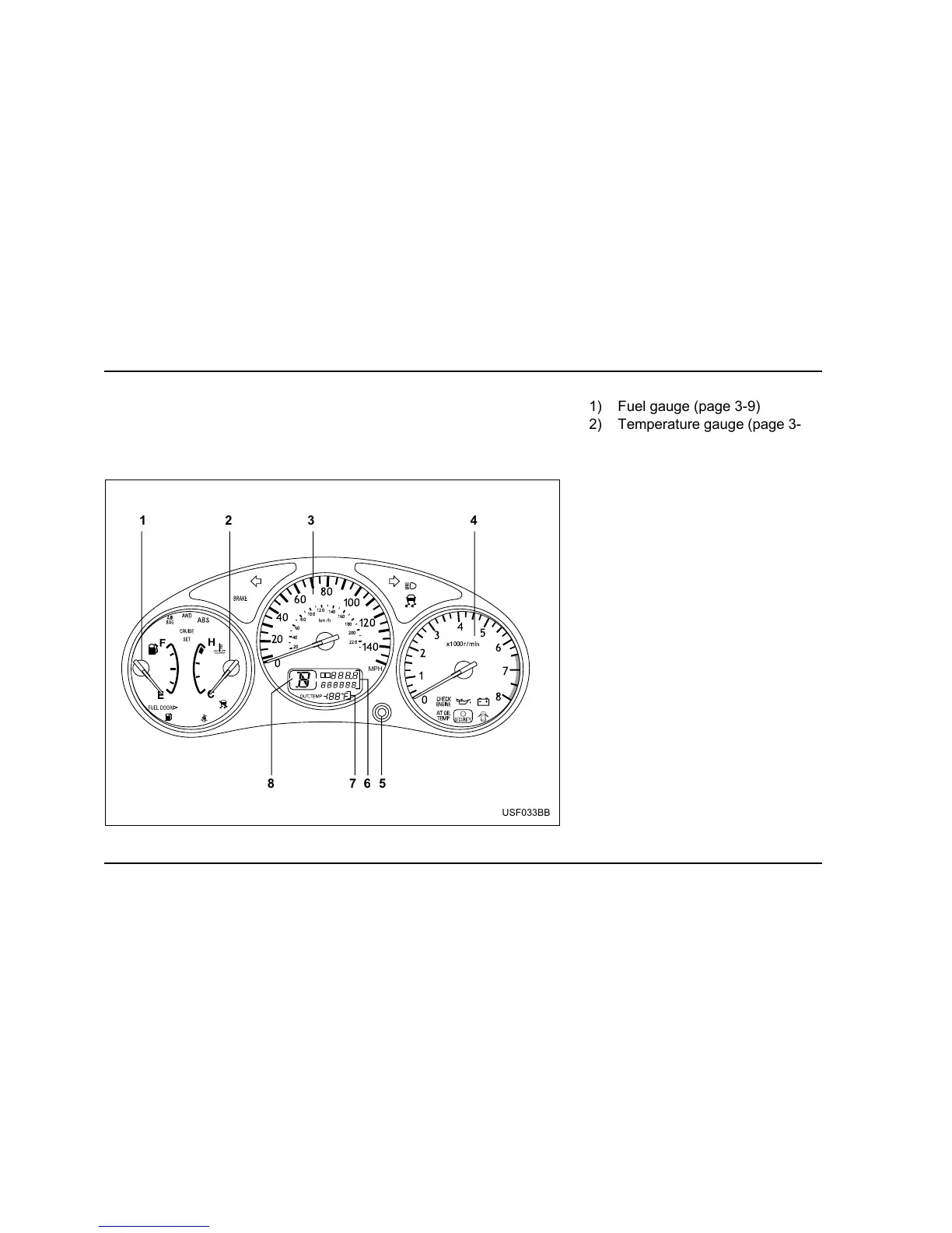 1) Fuel gauge (page 3-9)