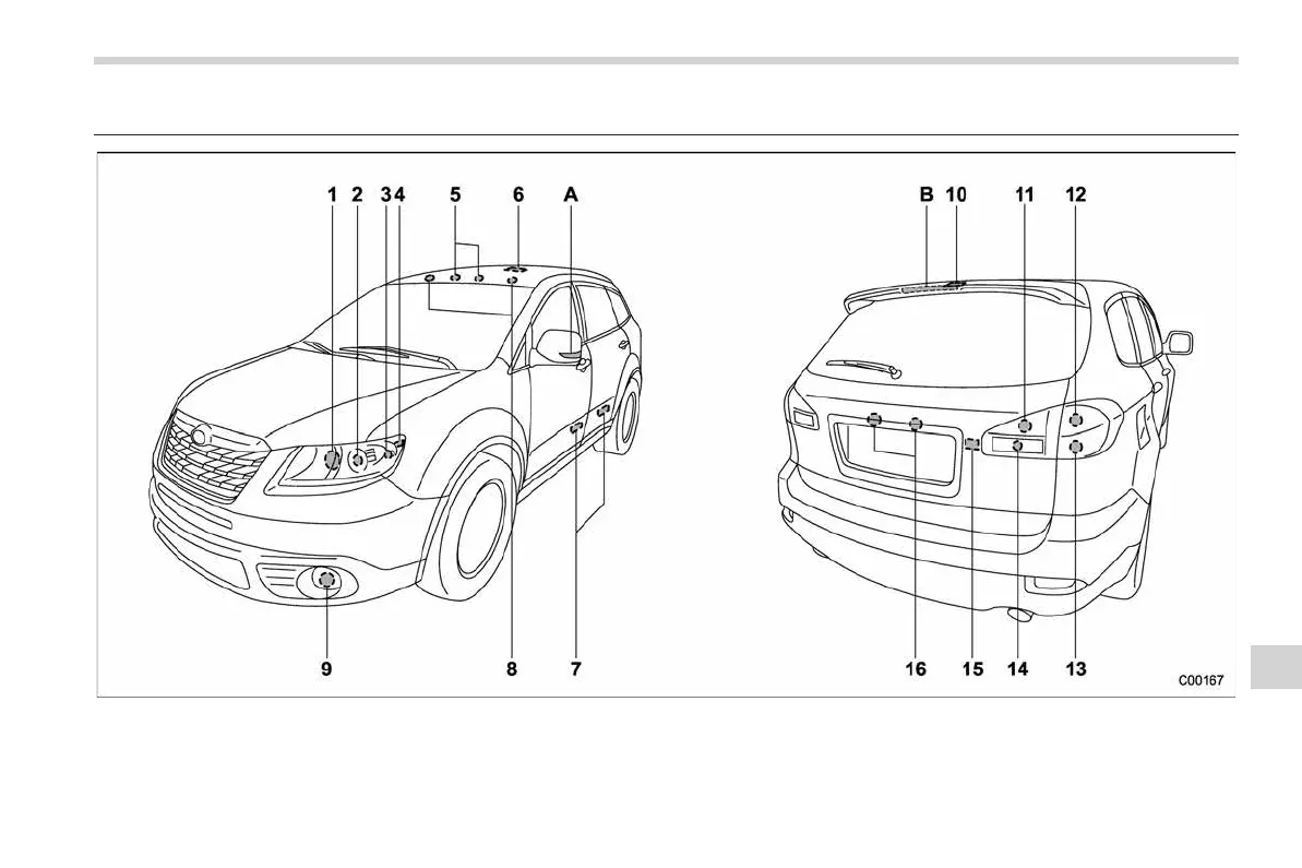 Lights A and B are the LED (Light Emitting Diode) type. Consult your SUBARU dealer for replacement.