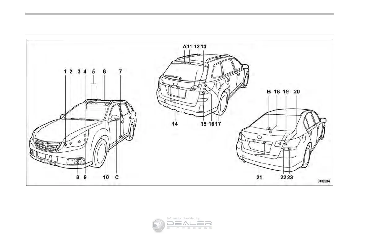 Lights A, B and C are the LED (Light Emitting Diode) type. Consult your SUBARU dealer for replacement.