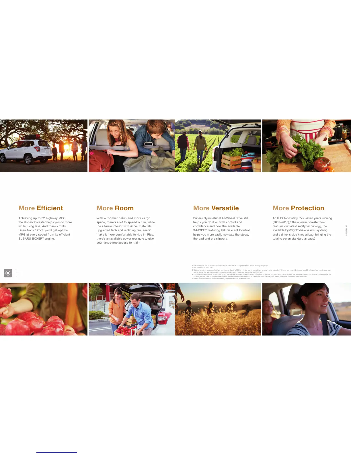 1 EPA estimated fuel economy for 2014 Forester 2.5i CVT at 32 highway MPG. Actual mileage may vary.