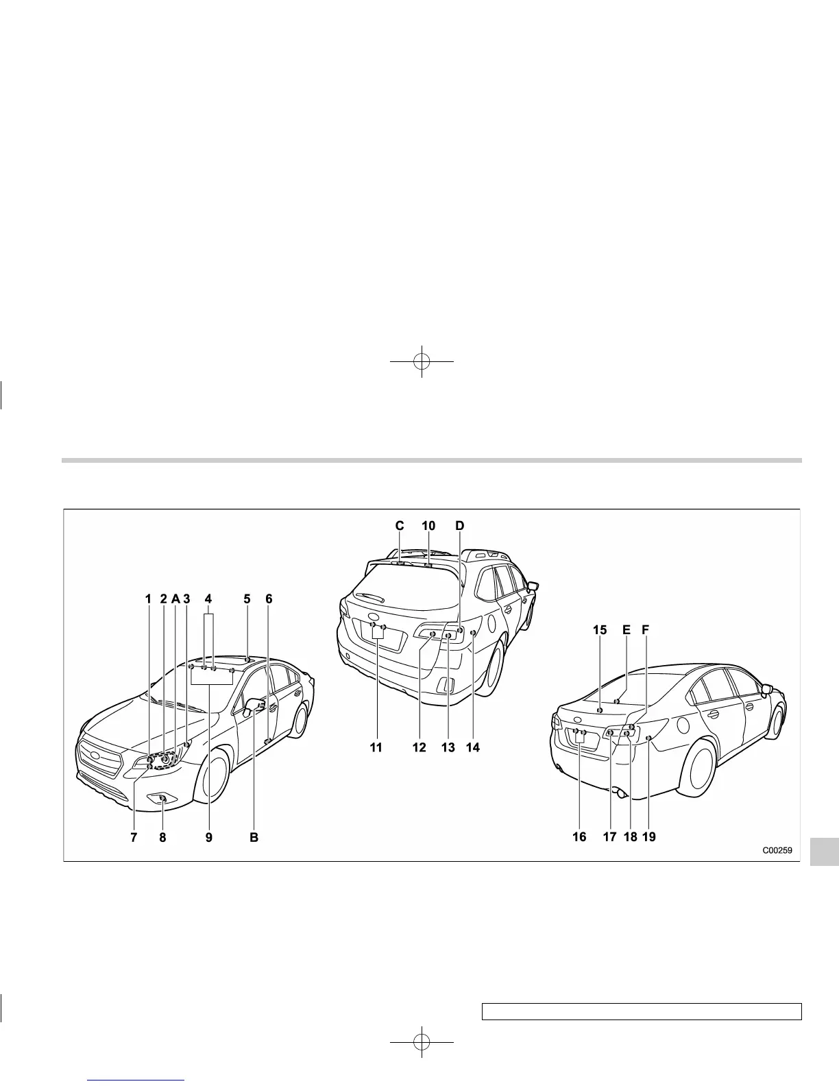 Lights A, B, C, D, E and F are the LED (Light Emitting Diode) type. Consult your SUBARU dealer for replacement.