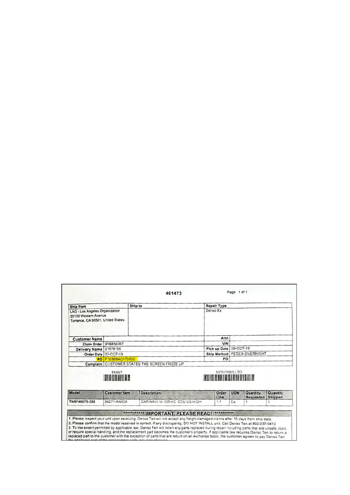 below) from the DENSO/Denso Ten exchange unit “Packing Slip” included with the delivery of every
