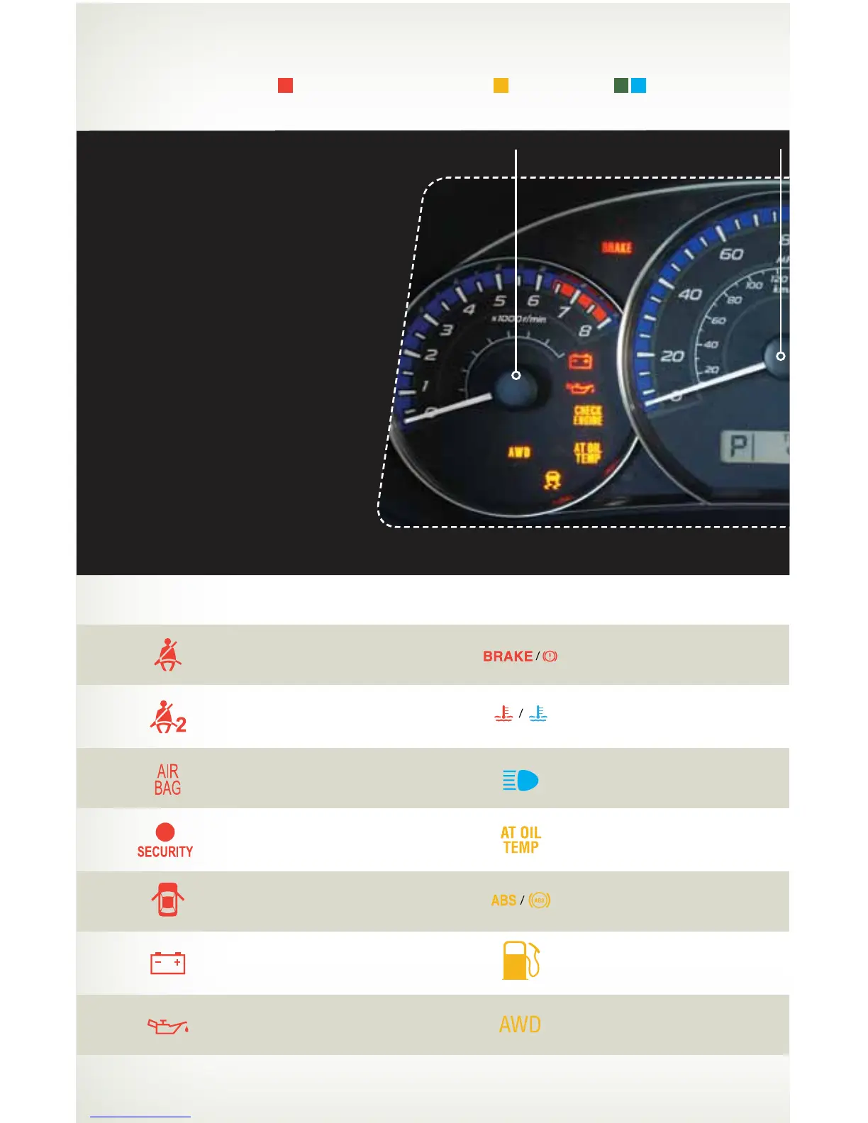 Subaru Forester 2011 - Gauges and Warning Lights; Immediate Attention Warning Lights; Caution Warning Lights