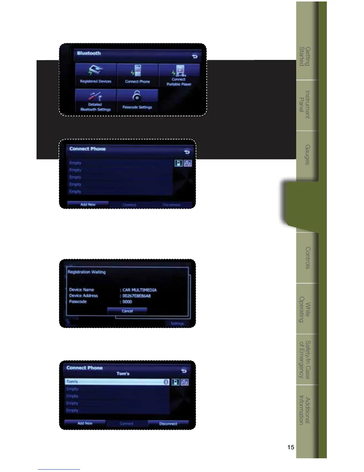 make, model and software; the phone may connect automatically or the pass-key