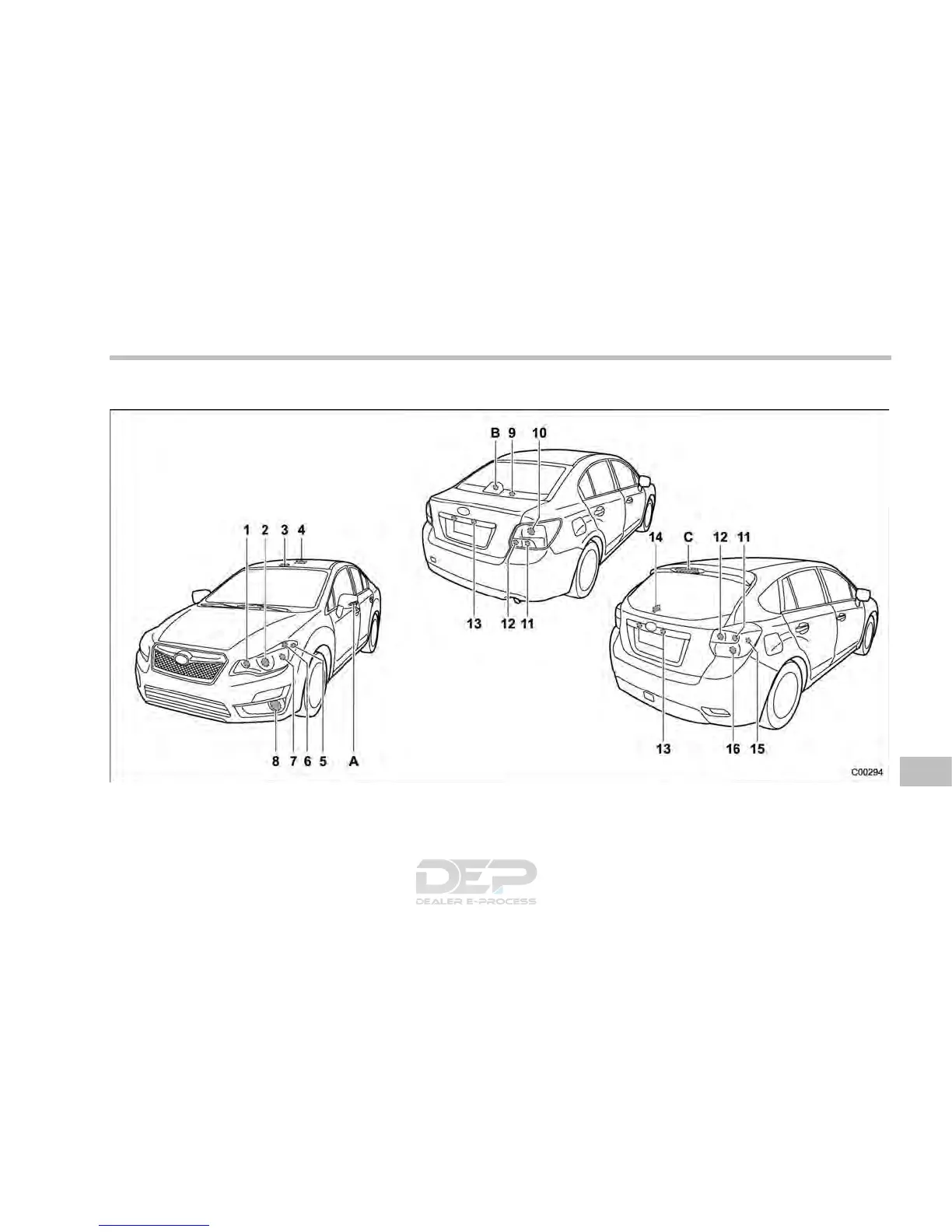Lights A, B and C are the LED (Light Emitting Diode) type. Consult your SUBARU dealer for replacement.