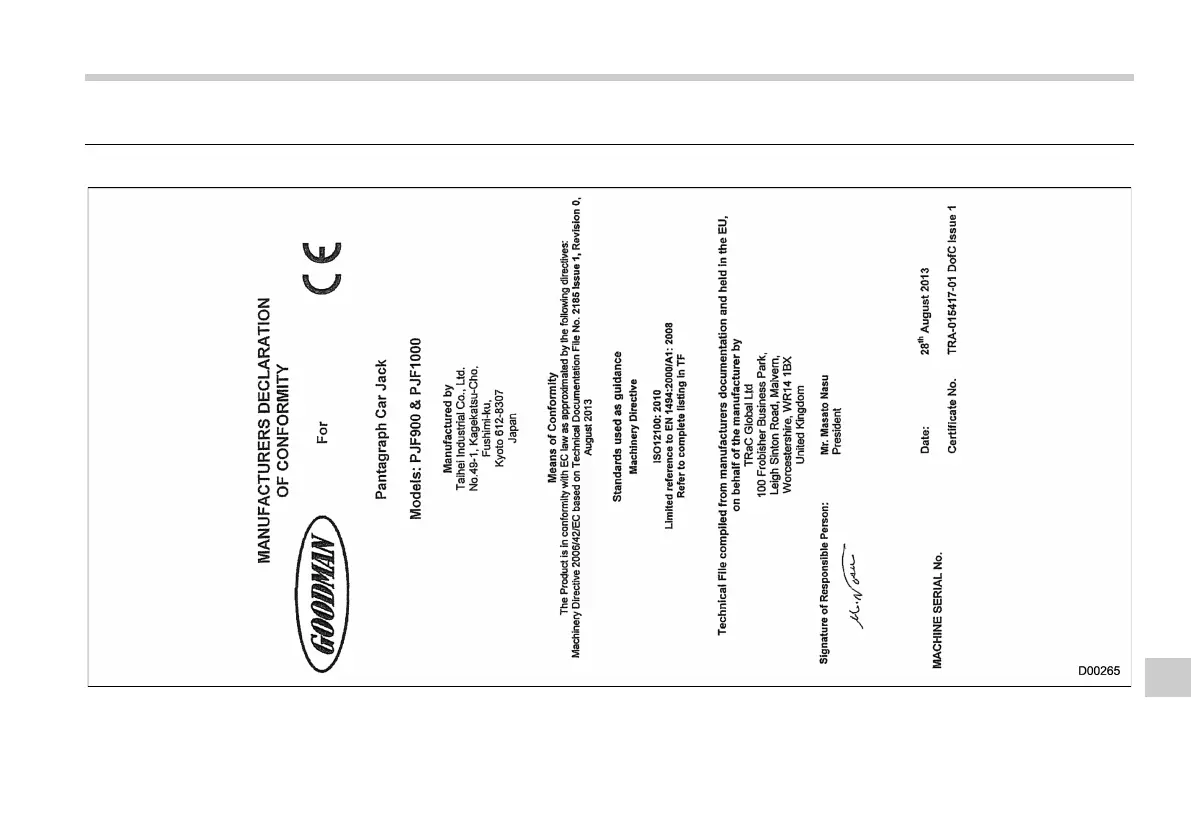 Subaru Outback 2015 - Declaration of Conformity in Accordance with the Machinery Directive 2006;42;EC; Jack