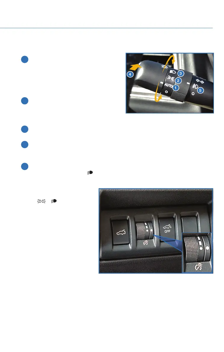 5 Fog Lights: If equipped, rotate the dial to turn on the fog lights when the headlights
