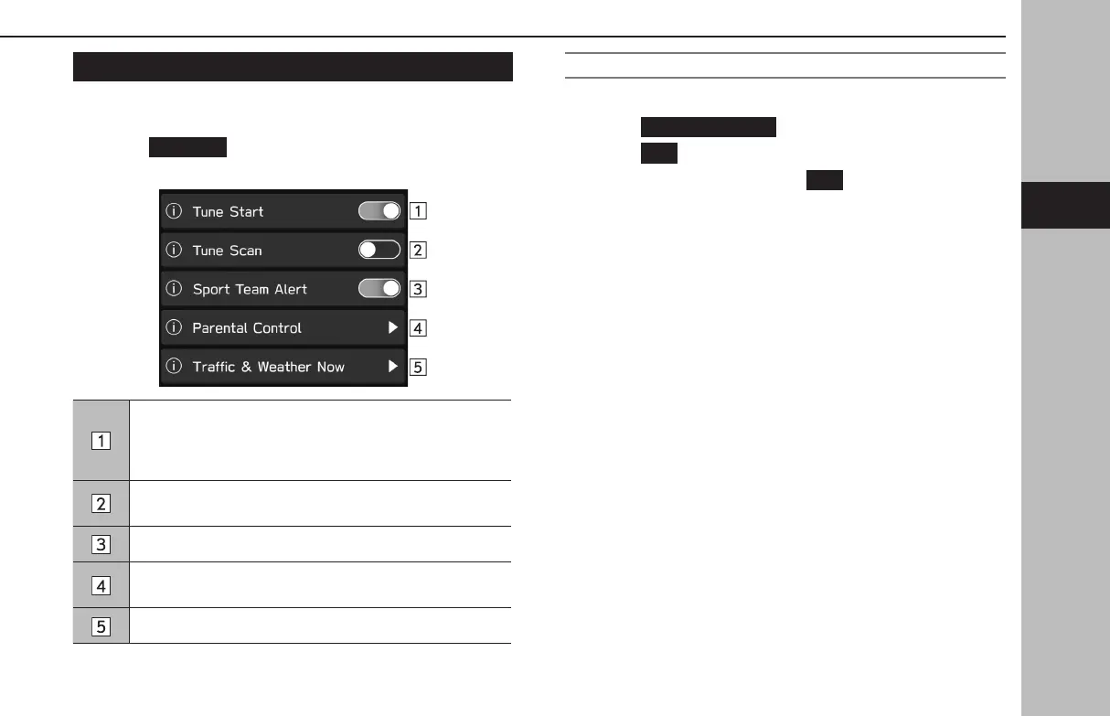 Select to turn the “Sport Team Alert” on/o. (→P.156)