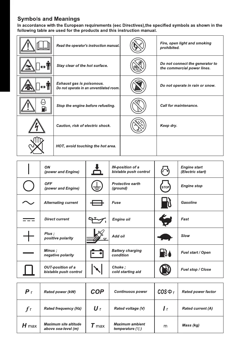 Subaru RGX6500/E - Understanding Symbols and Meanings; Safety, Operation, and Technical Symbols