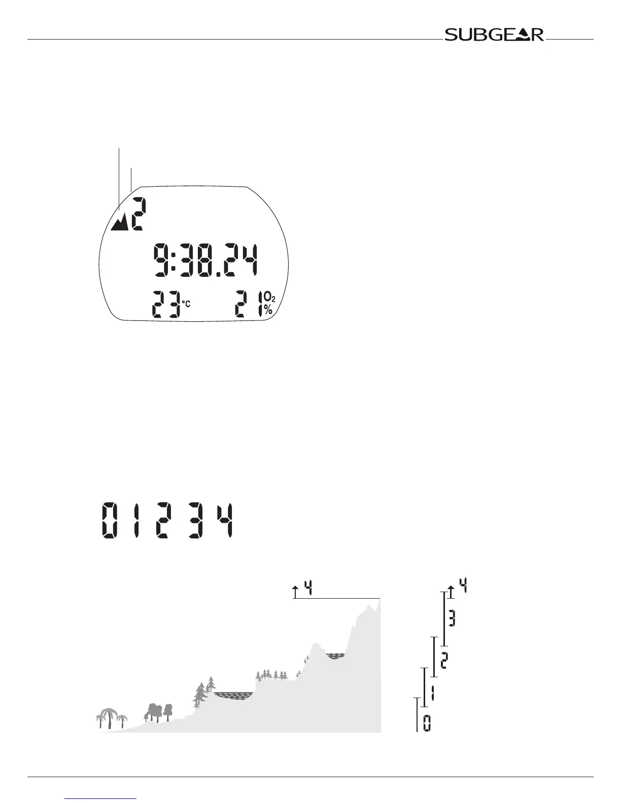 altitude range is indicated at the surface (time of day display), in the logbook and in the