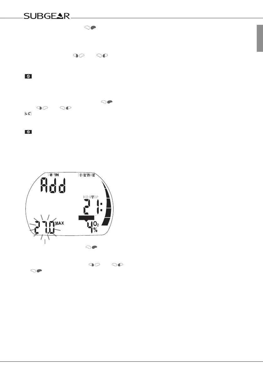 2. Set the desired depth with and , then switch into decompression planning by pushing