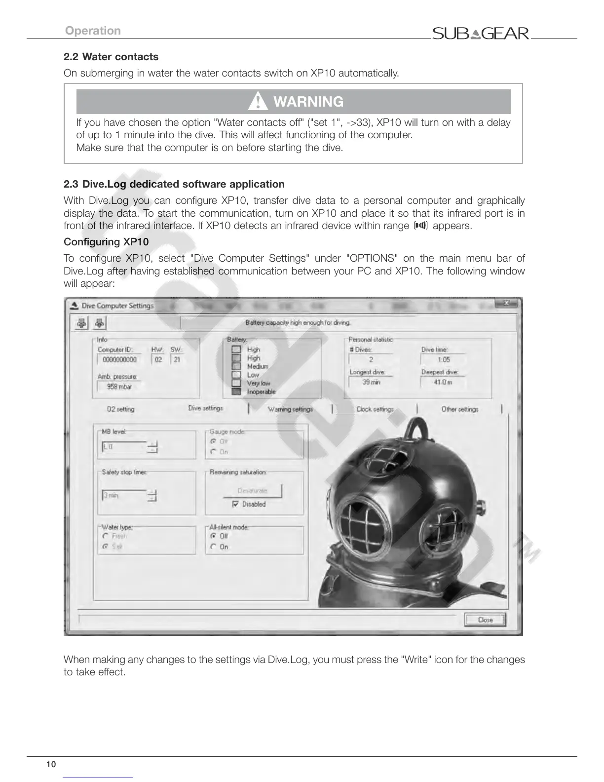 With Dive.Log you can configure XP10, transfer dive data to a personal computer and graphically