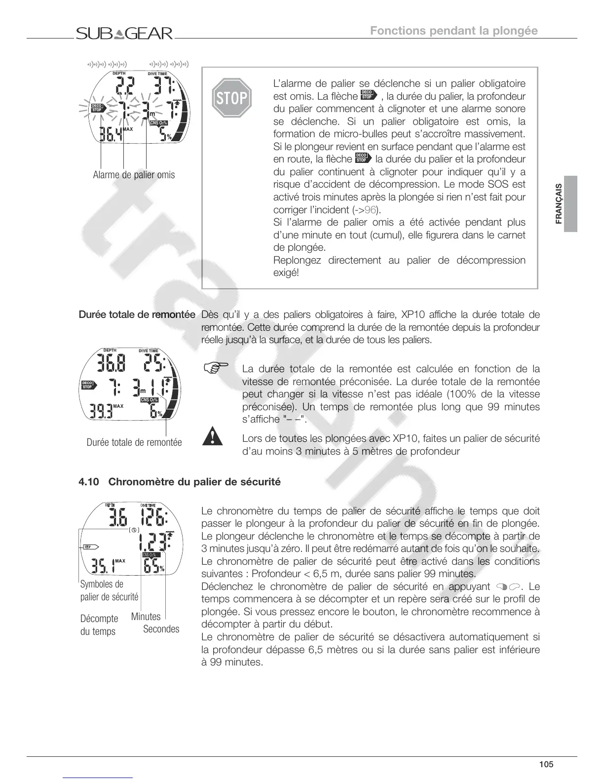 Le chronomètre de palier de sécurité peut être activé dans les conditions