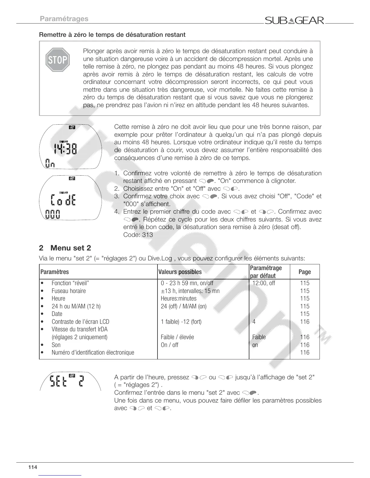 Via le menu "set 2" (= "réglages 2") ou Dive.Log , vous pouvez configurer les éléments suivants: