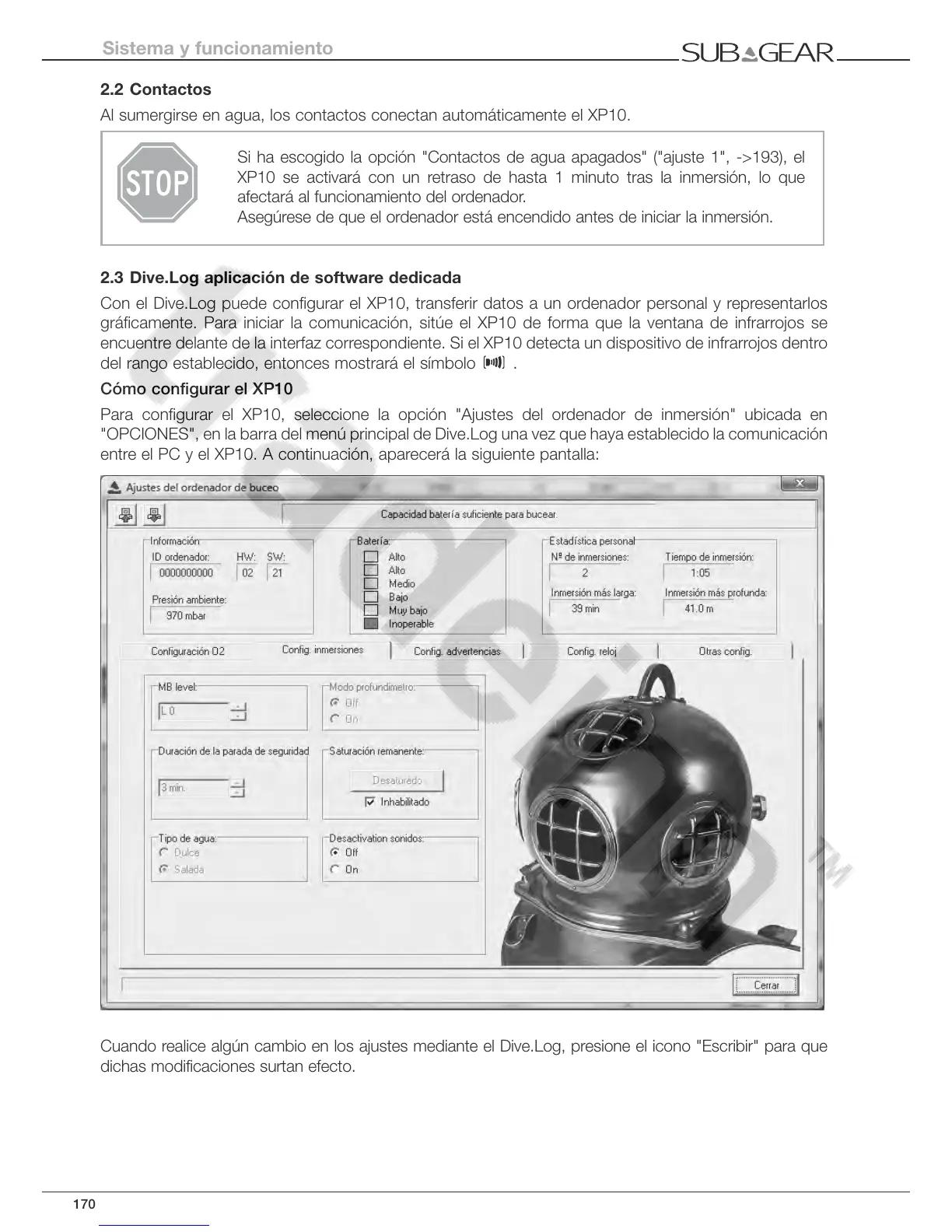 Cuando realice algún cambio en los ajustes mediante el Dive.Log, presione el icono "Escribir" para que