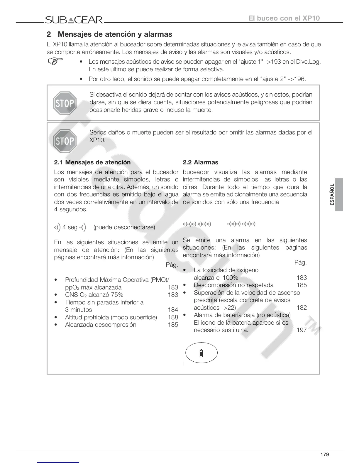 • Los mensajes acústicos de aviso se pueden apagar en el "ajuste 1" ->193 en el Dive.Log.