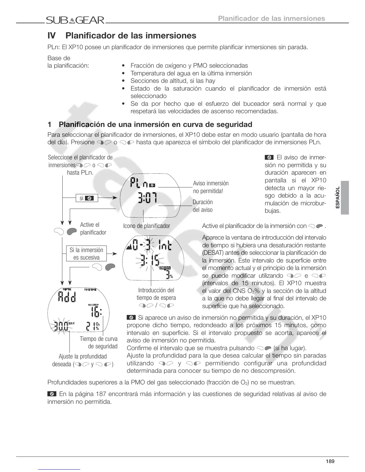 Para seleccionar el planificador de inmersiones, el XP10 debe estar en modo usuario (pantalla de hora