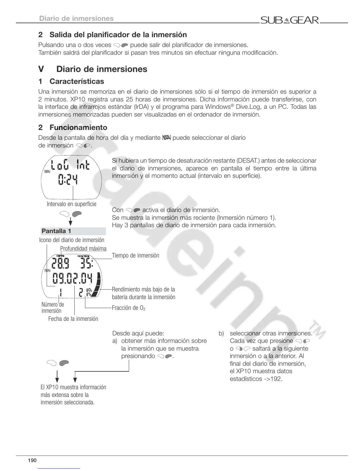 2 minutos. XP10 registra unas 25 horas de inmersiones. Dicha información puede transferirse, con