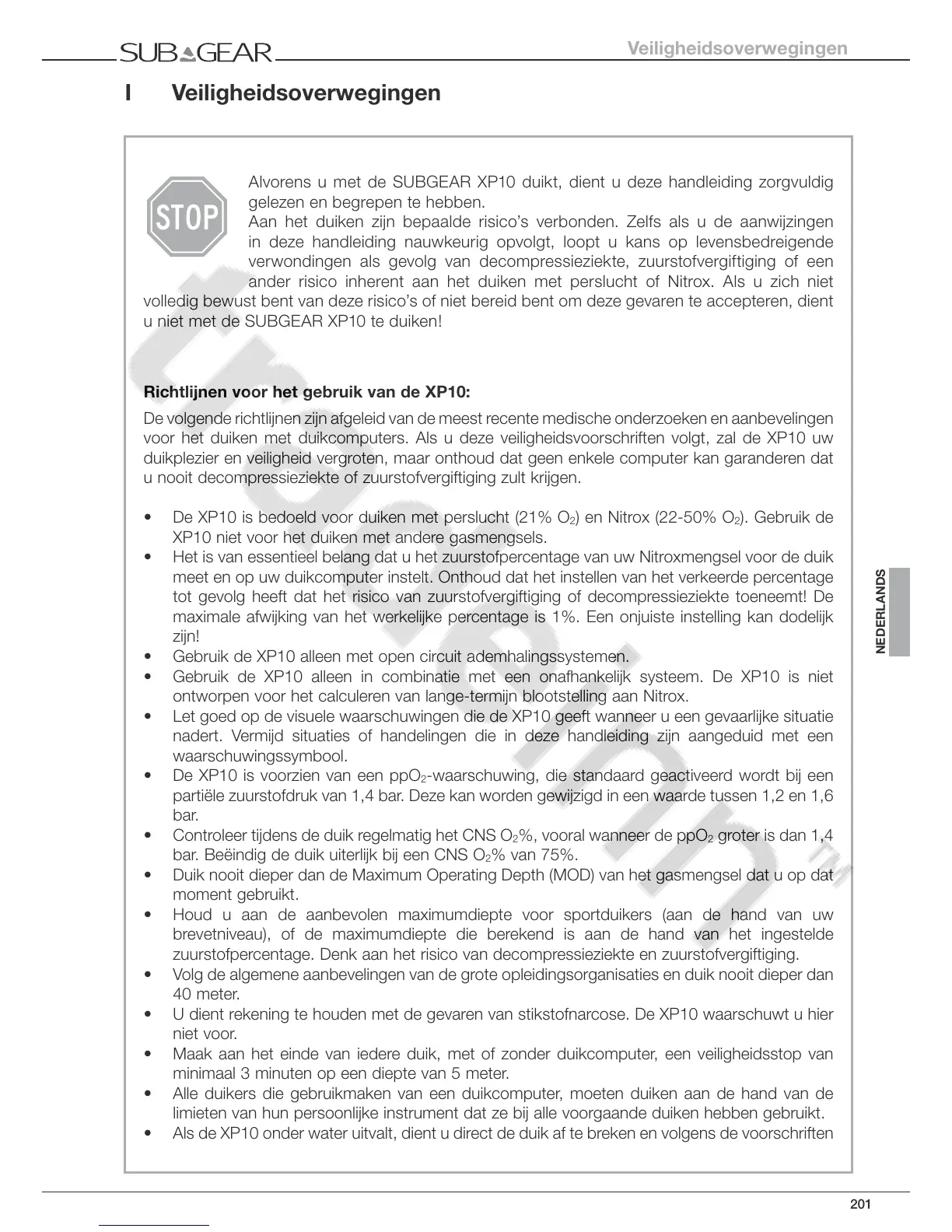 Alvorens u met de SUBGEAR XP10 duikt, dient u deze handleiding zorgvuldig