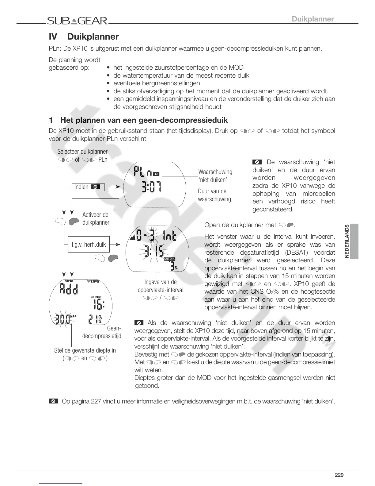 Op pagina 227 vindt u meer informatie en veiligheidsoverwegingen m.b.t. de waarschuwing ‘niet duiken’.