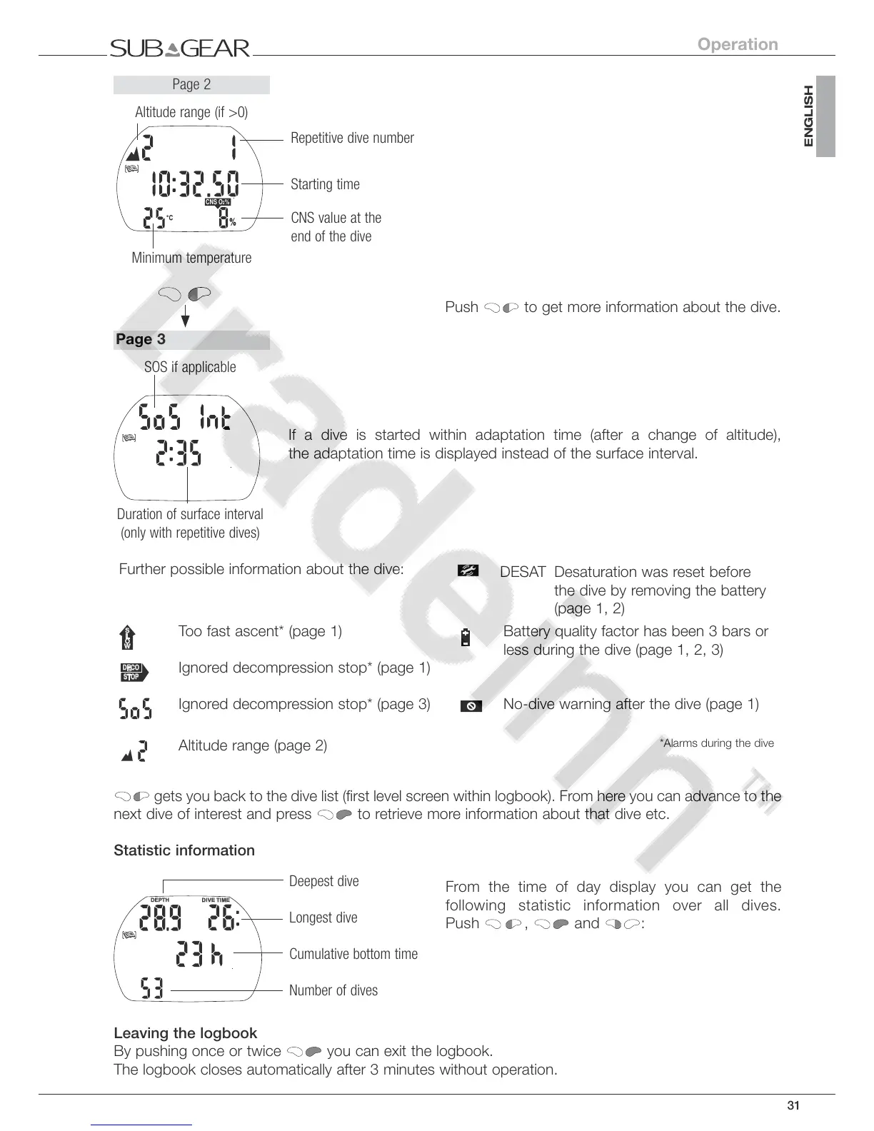 Ignored decompression stop* (page 3) No-dive warning after the dive (page 1)