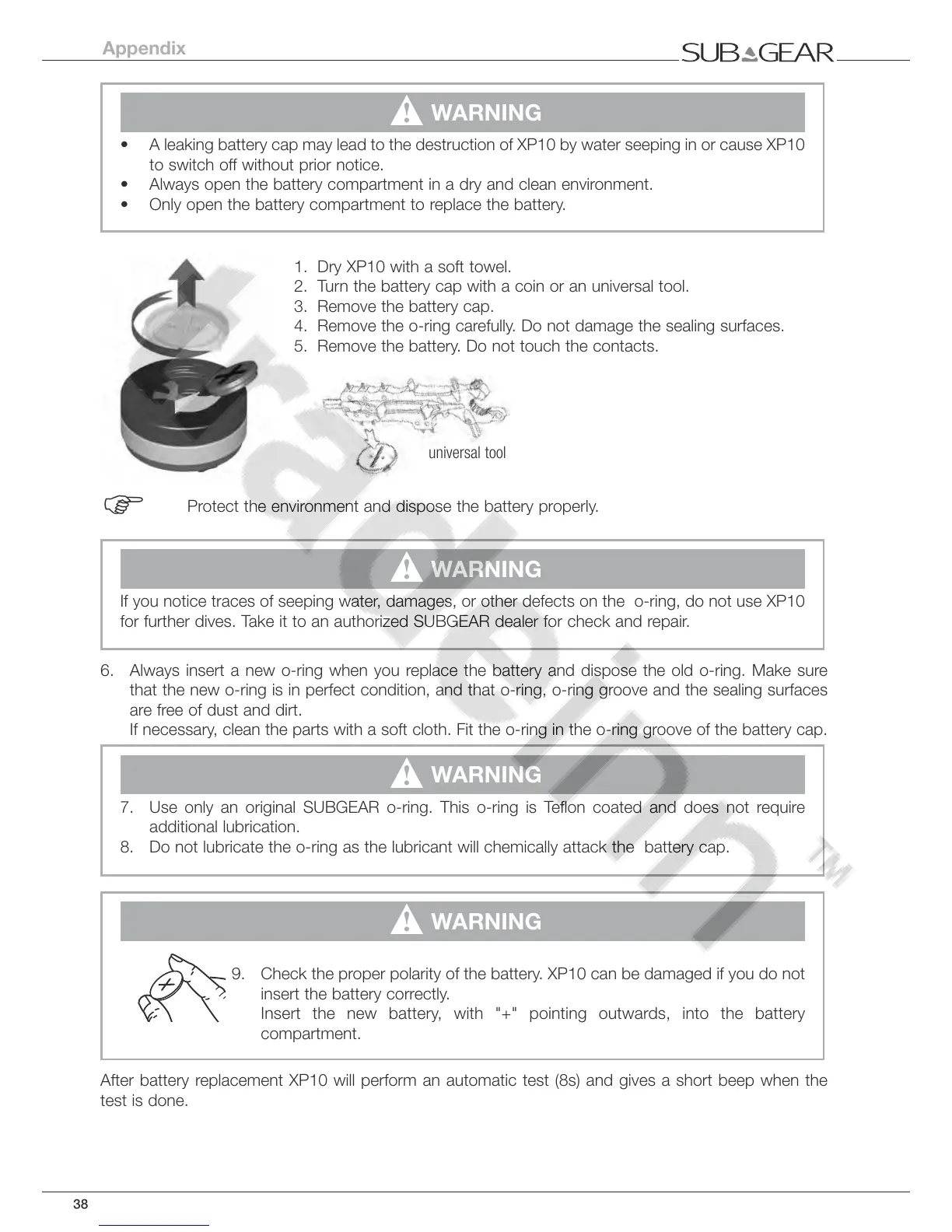 After battery replacement XP10 will perform an automatic test (8s) and gives a short beep when the
