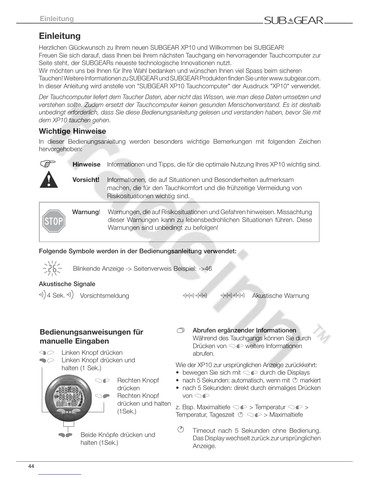In dieser Anleitung wird anstelle von "SUBGEAR XP10 Tauchcomputer" der Ausdruck "XP10" verwendet.