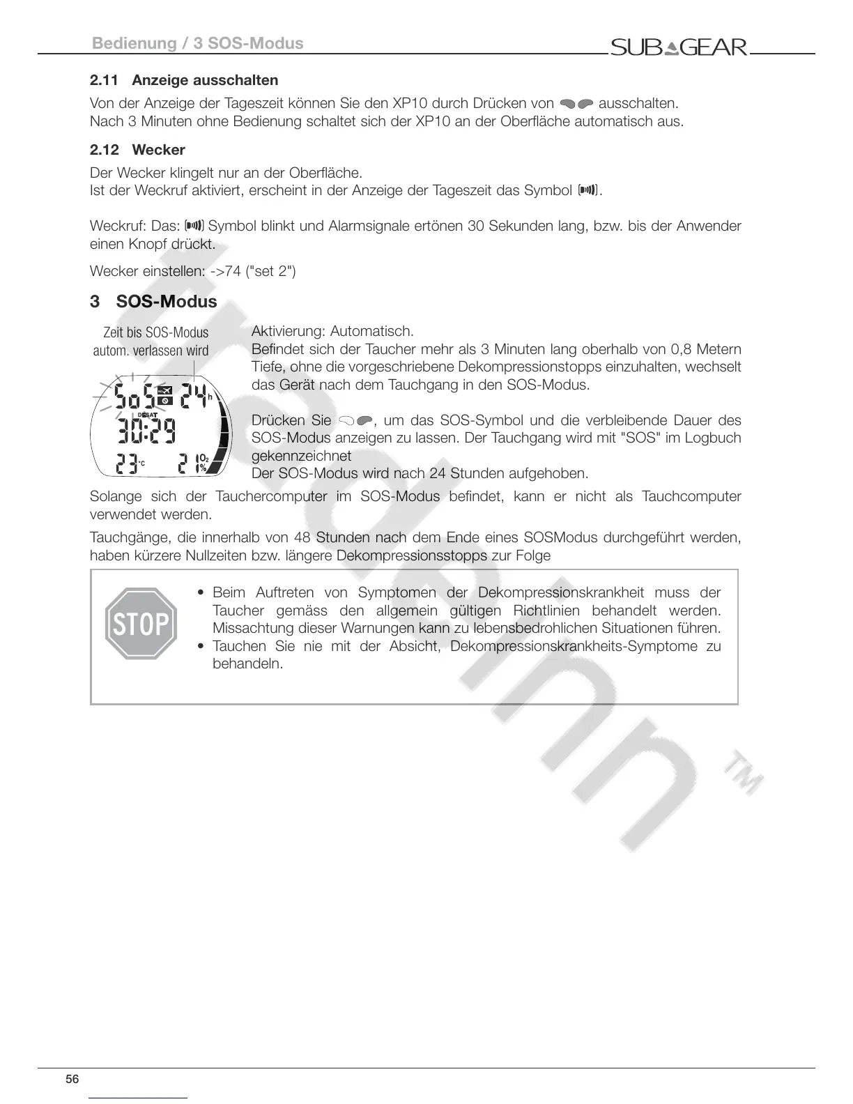 SOS-Modus anzeigen zu lassen. Der Tauchgang wird mit "SOS" im Logbuch