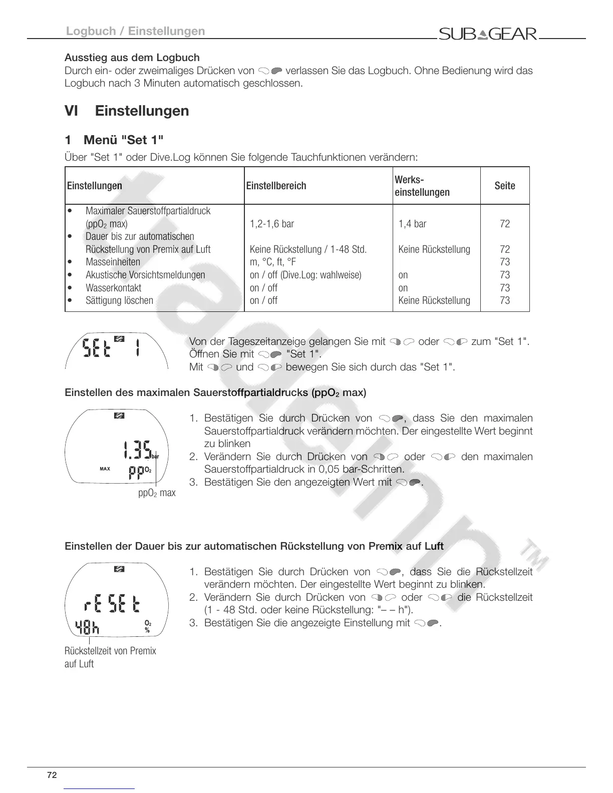 Über "Set 1" oder Dive.Log können Sie folgende Tauchfunktionen verändern:
