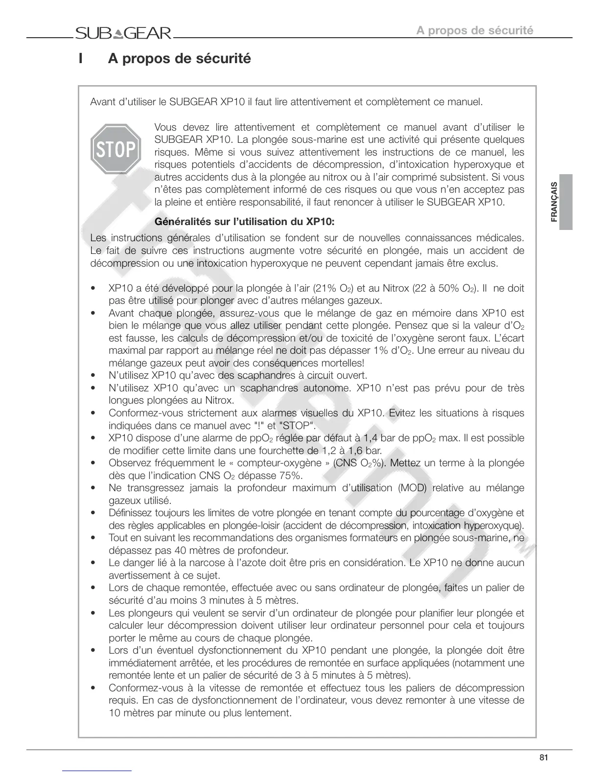 • N’utilisez XP10 qu’avec un scaphandres autonome. XP10 n’est pas prévu pour de très