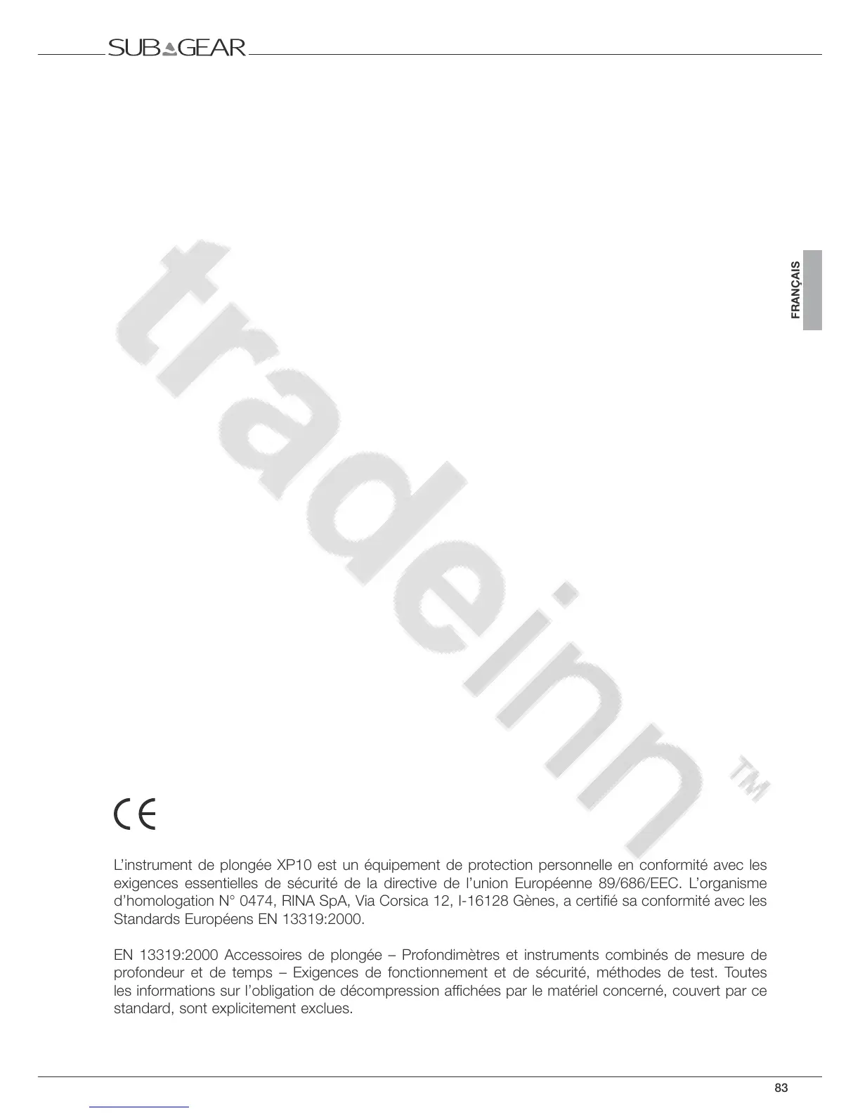 L’instrument de plongée XP10 est un équipement de protection personnelle en conformité avec les