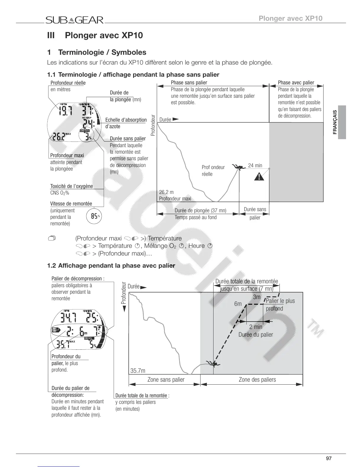 Les indications sur l’écran du XP10 diffèrent selon le genre et la phase de plongée.