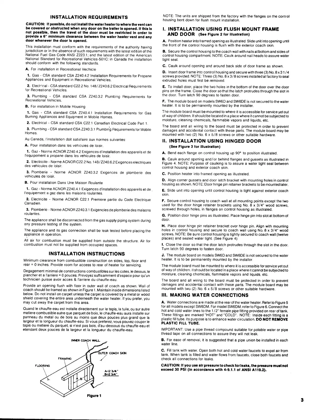 Suburban SW6DE - Installation Requirements; Minimum Installation Clearances; Framed Opening Requirements; Flush Mount Frame and Door Installation