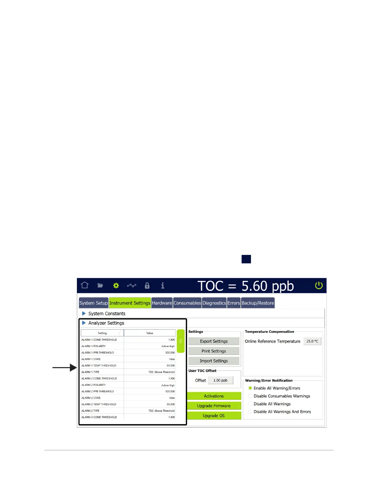 1. Navigate to the Analyzer Settings panel (Settings s screen > Instrument