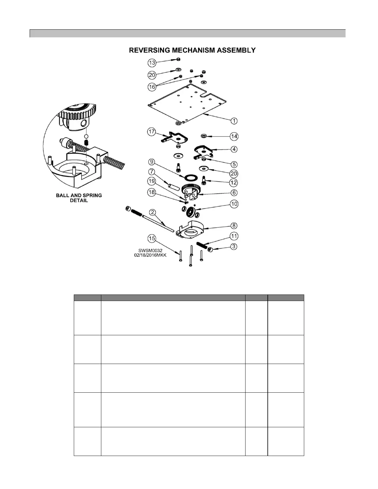 Table 30 - Reversing Mechanism Assembly Parts List