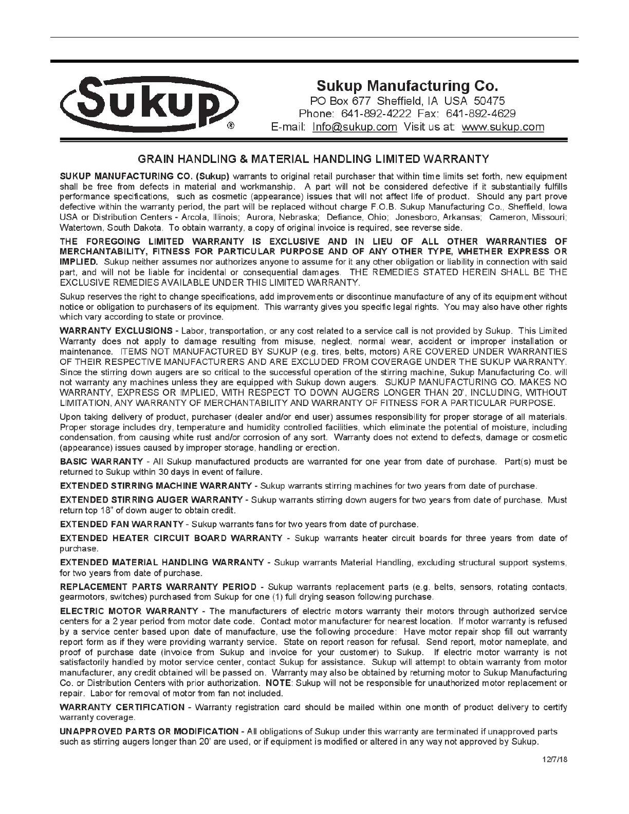 Sukup Sweepway - Limited Warranty; General Warranty Terms and Exclusions