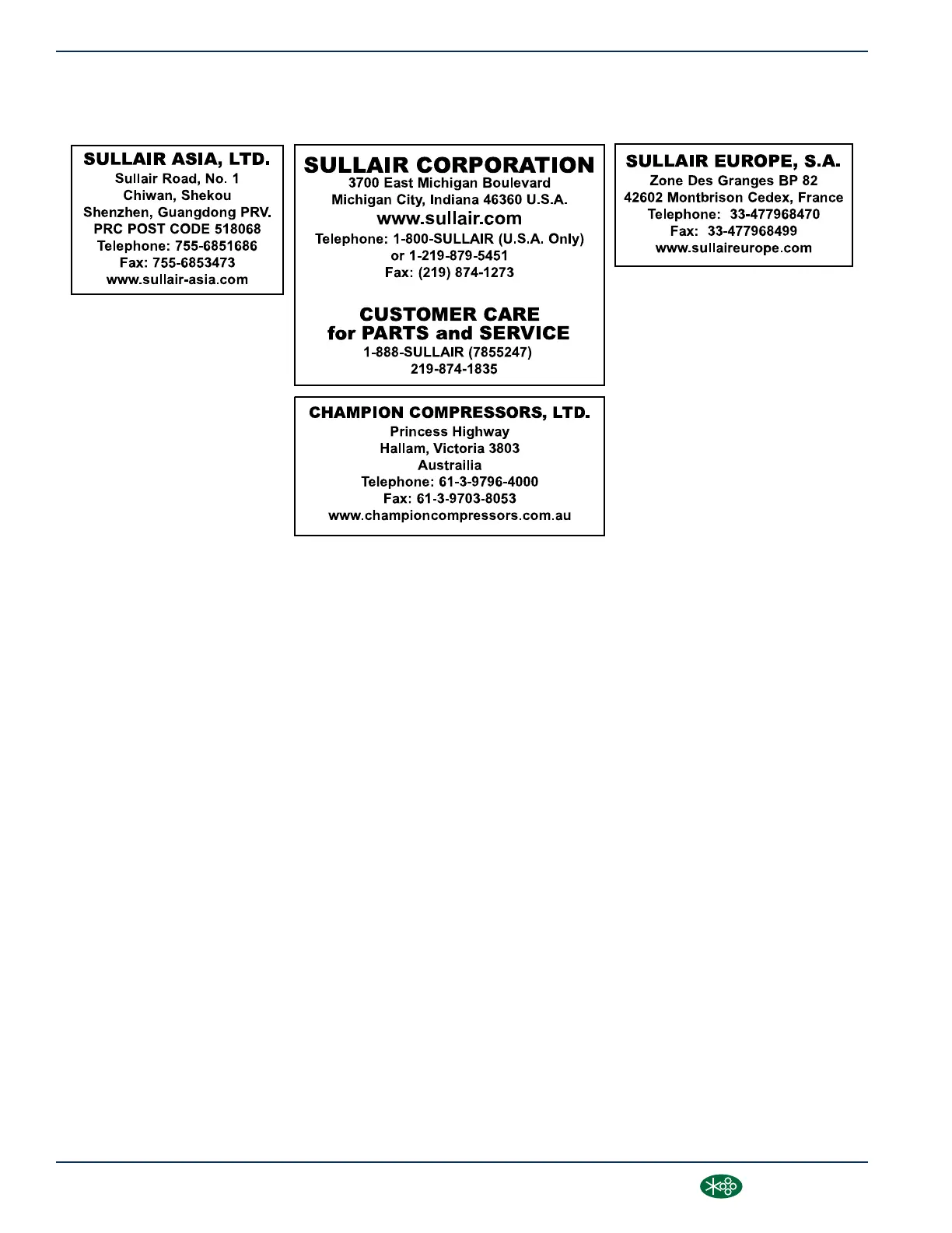 Parts should be ordered from the nearest Sullair Representative or the Representative from whom the compressor was