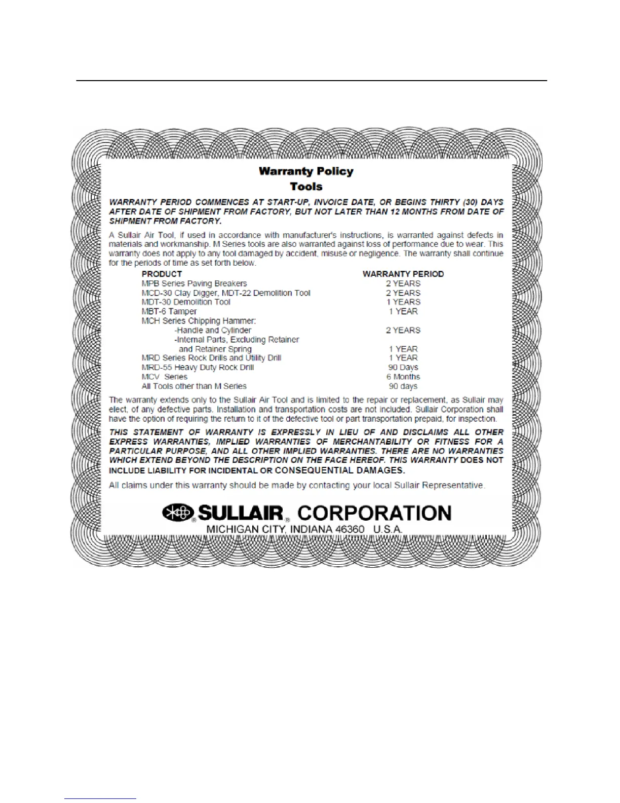 Sullair MCH-2RD - Warranty Policy