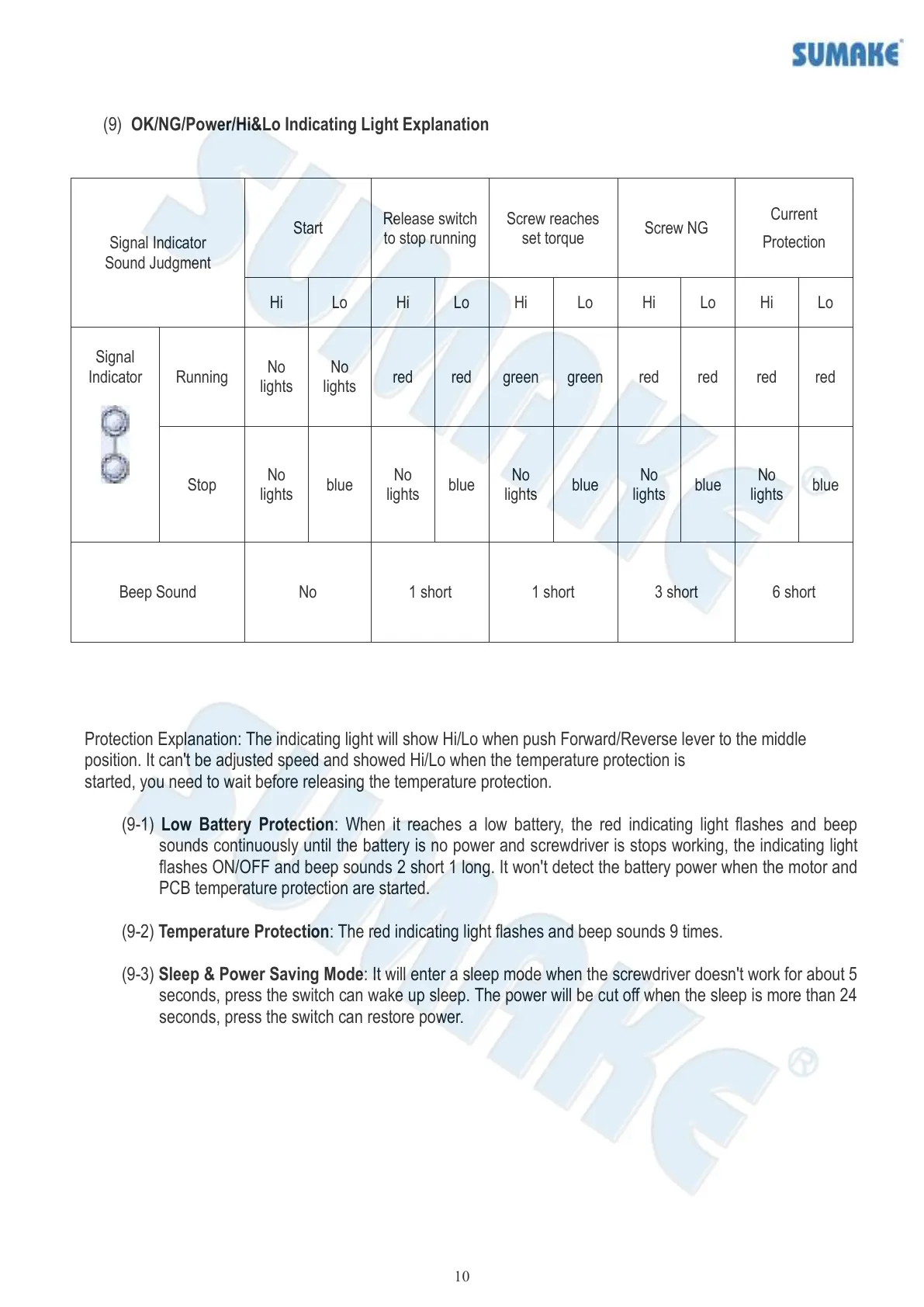 (9-1) Low Battery Protection: When it reaches a low battery, the red indicating light flashes and beep