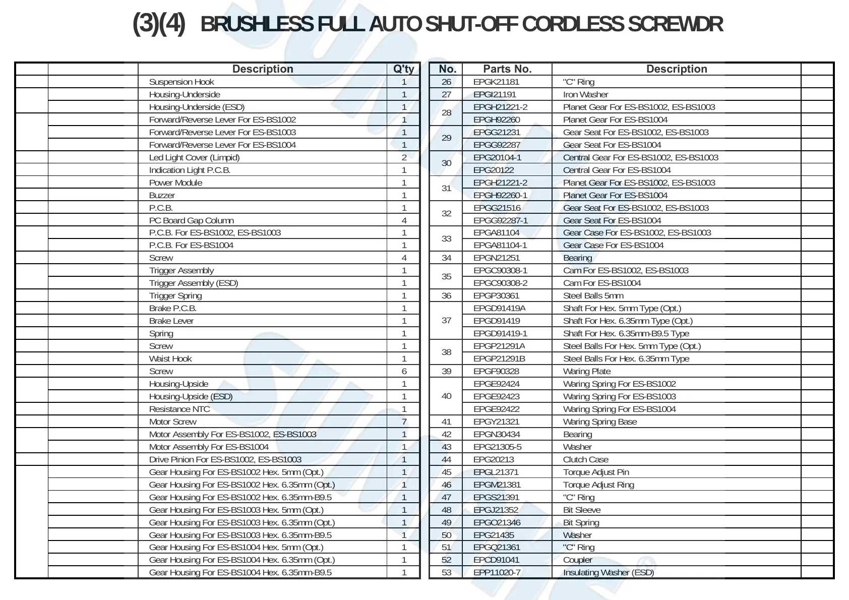 24 EPM11317-1 Drive Pinion For ES-BS1002, ES-BS1003 1 44 EPG20213 Clutch Case 1