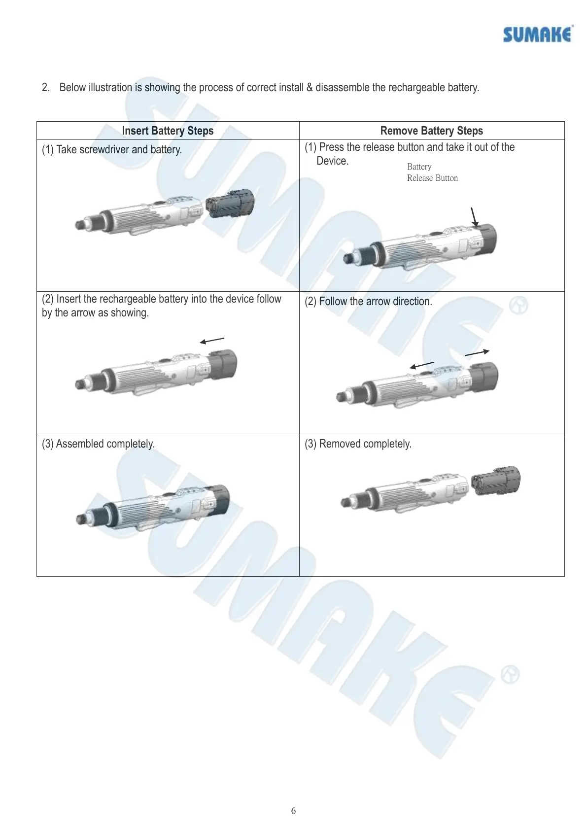 2. Below illustration is showing the process of correct install & disassemble the rechargeable battery.