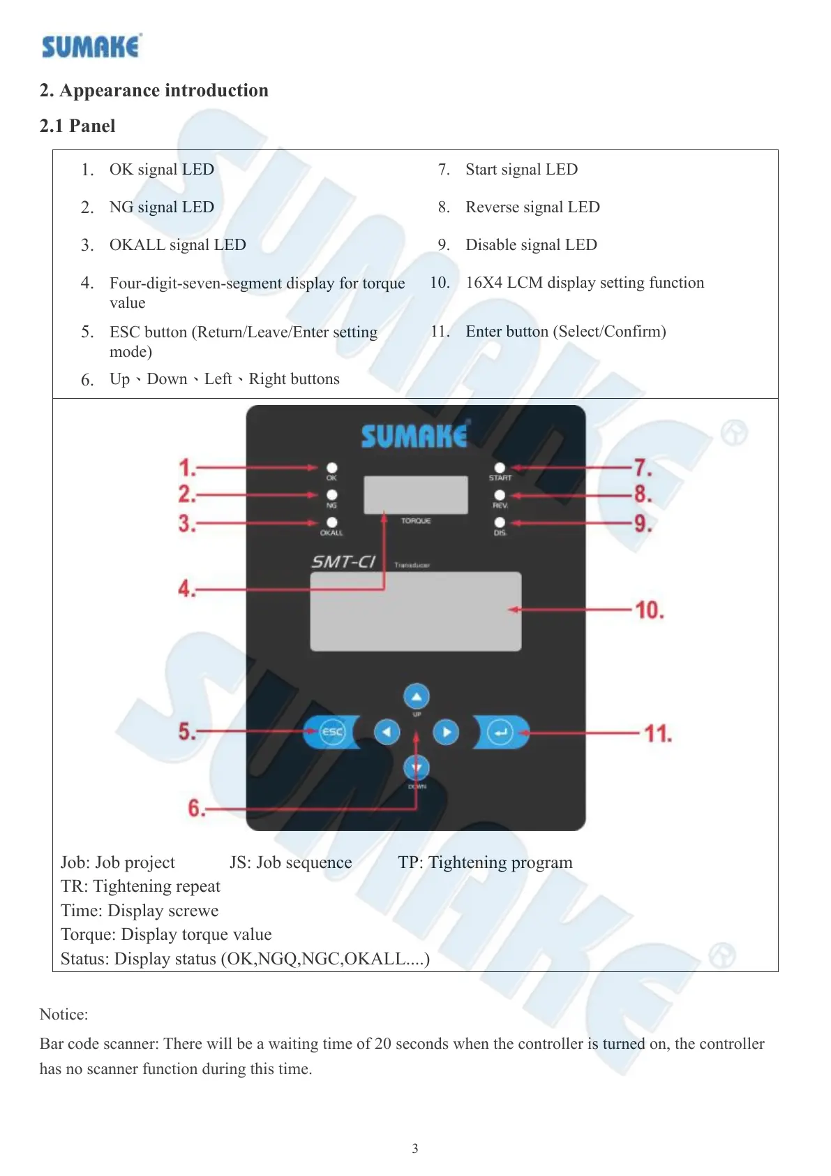 Bar code scanner: There will be a waiting time of 20 seconds when the controller is turned on, the controller