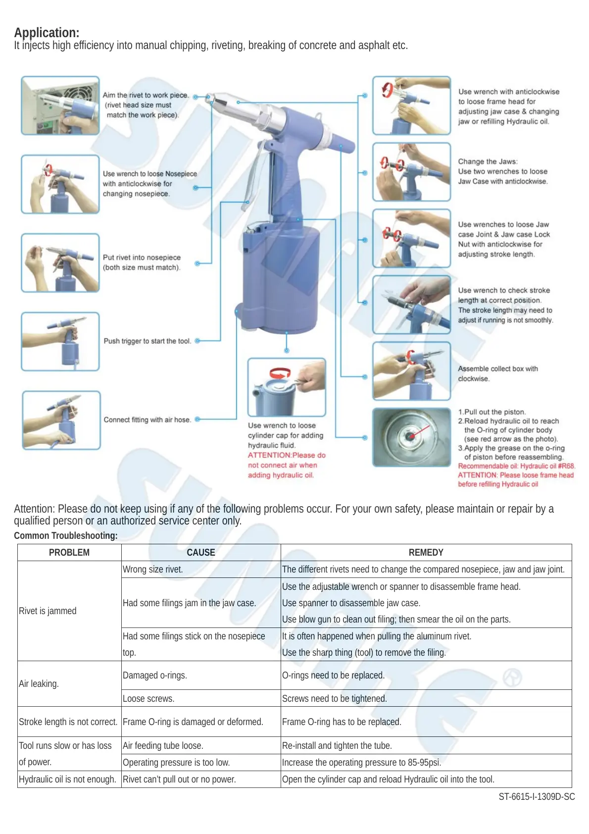 Hydraulic oil is not enough. Rivet can’t pull out or no power. Open the cylinder cap and reload Hydraulic oil into the tool.