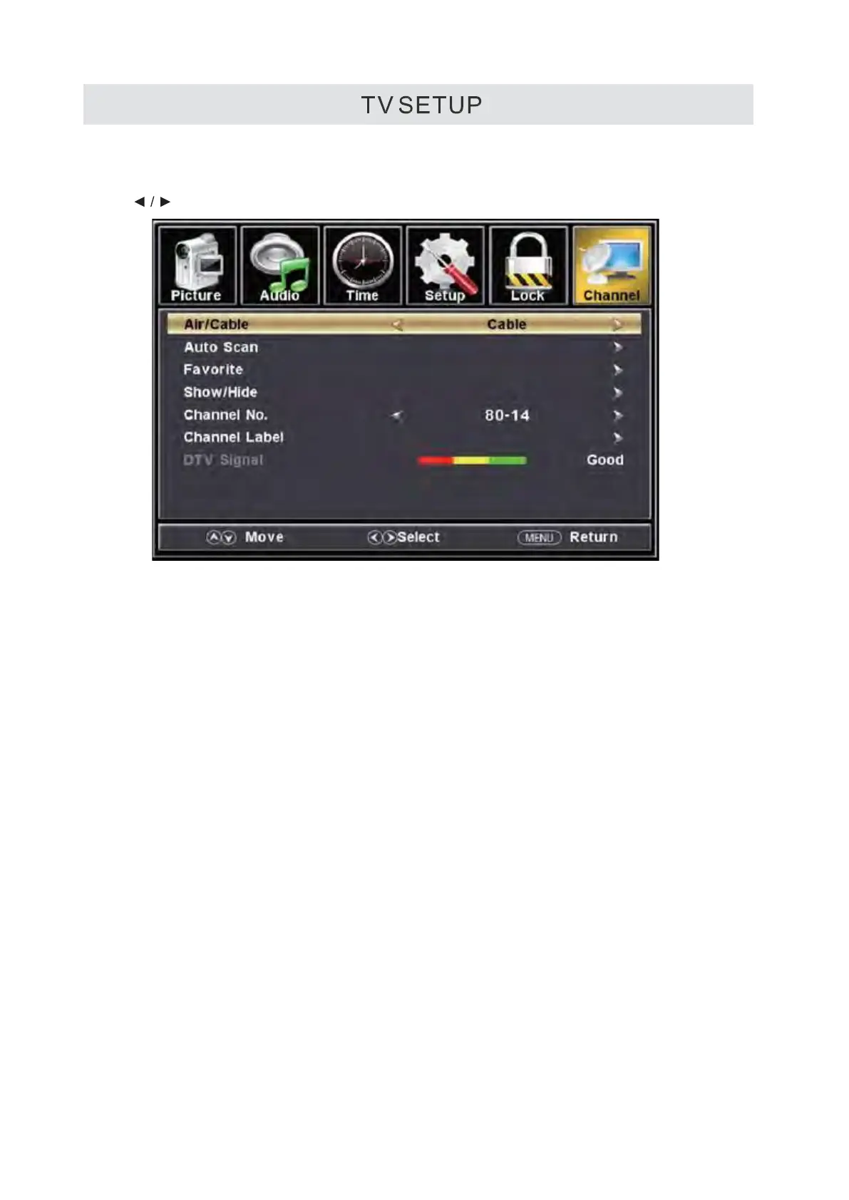 Press button to select CHANNEL in the main menu, it will high light the first option.