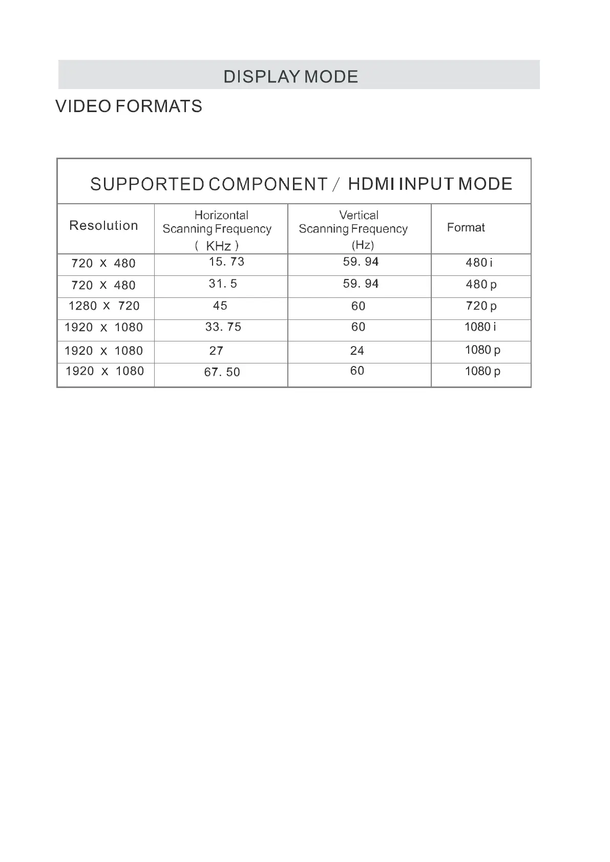 Sumec LED32SU20C - Display Mode Guide; Supported Component;HDMI Input Modes