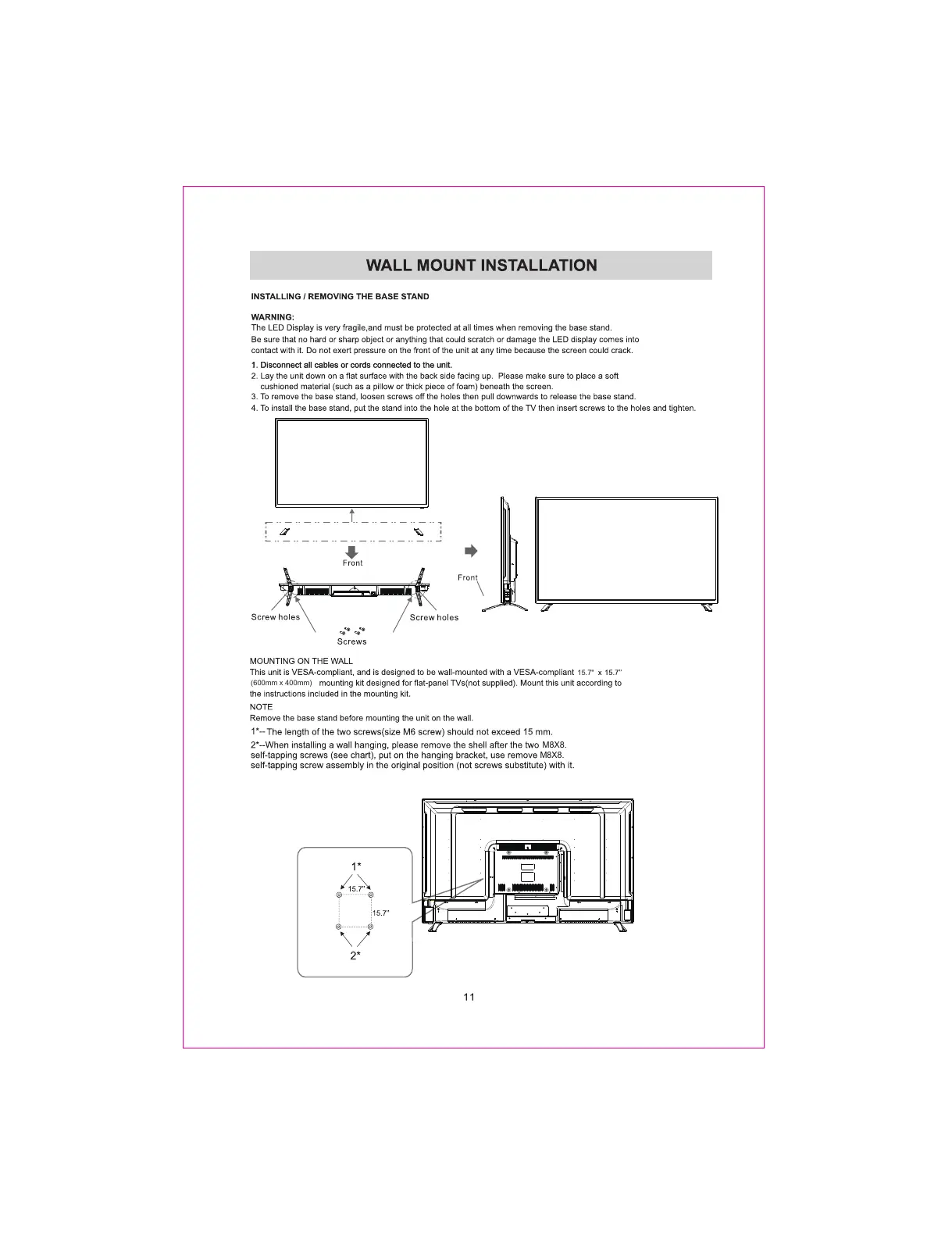 Sumec ULD50SU4KC - WALL MOUNT INSTALLATION; Mounting on the Wall