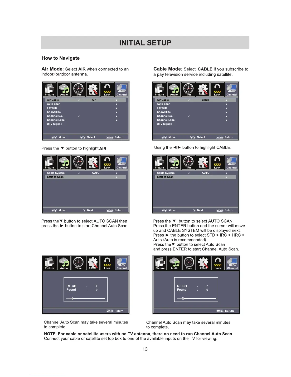 Sumec ULD65SU4KC - Initial Setup Guide; Navigating Air Mode Setup; Navigating Cable Mode Setup