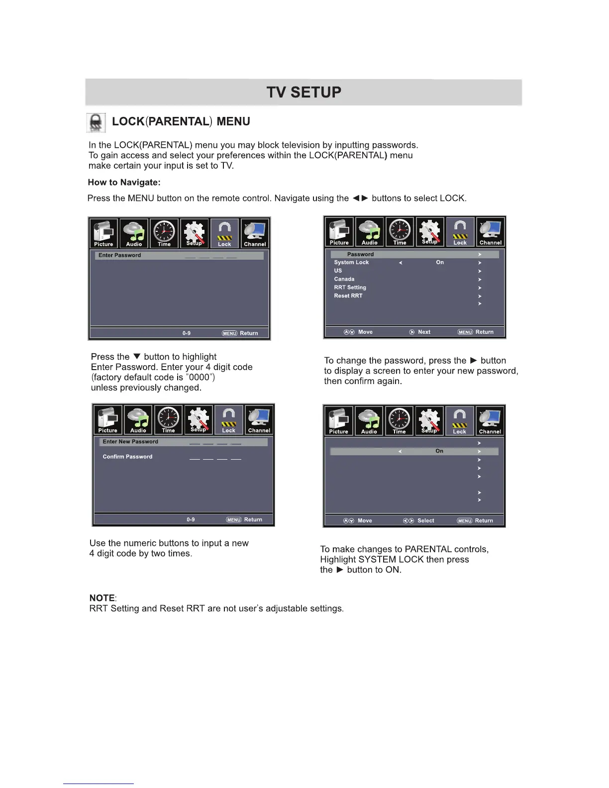 Sumec ULD65SU4KC - Lock (Parental) Menu Setup; Changing Parental Control Passwords
