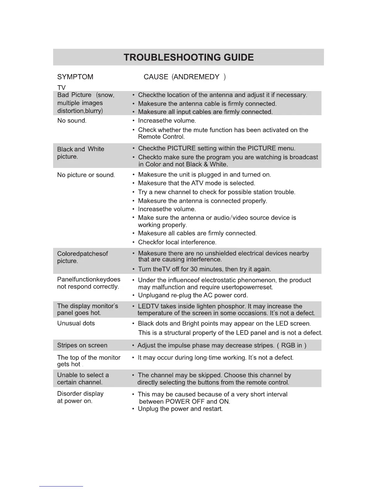 Sumec ULD65SU4KC - Troubleshooting Guide; Bad Picture and Audio Issues; Picture and Sound Problems; Operational and Channel Issues